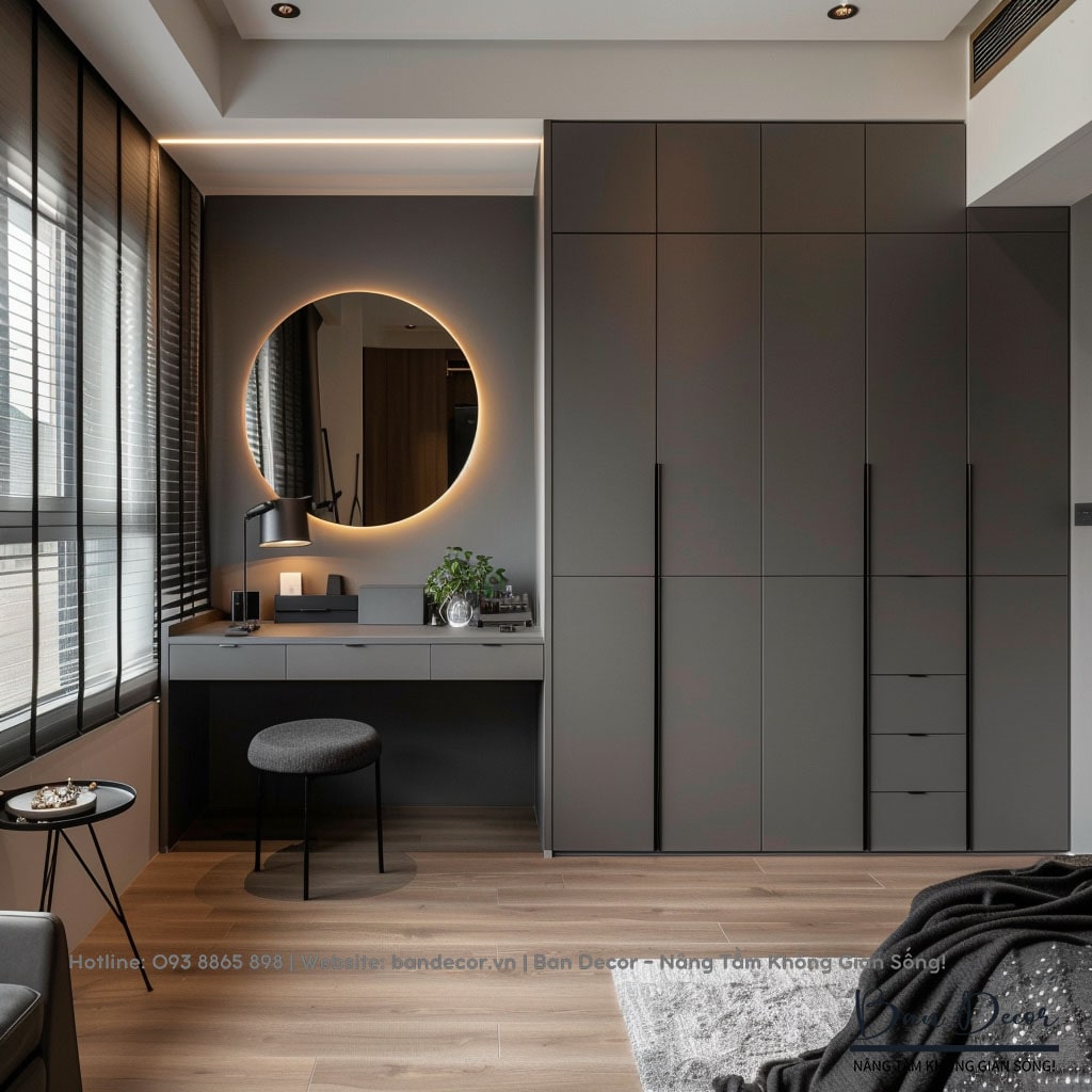 KT: 2.4x2.2m, gỗ MDF phủ Melamine chống trầy xước.