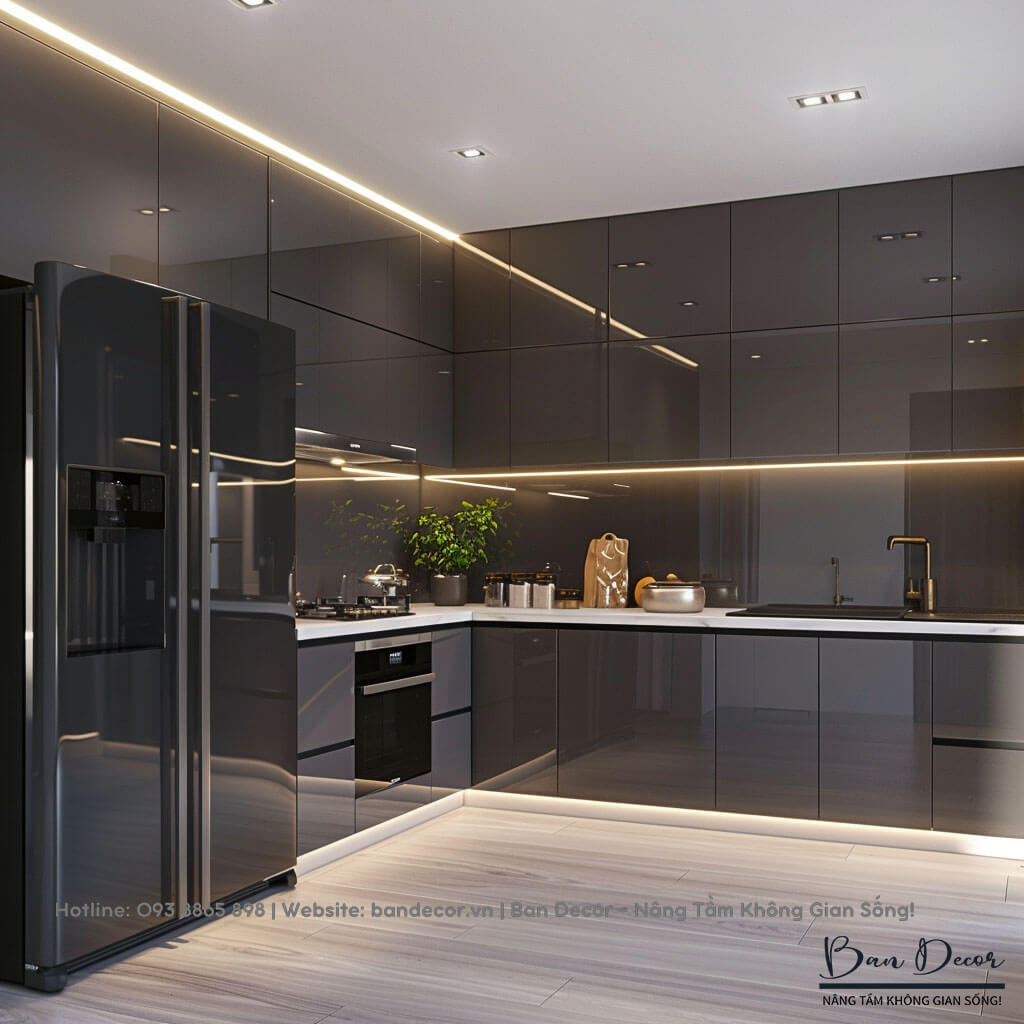 THI CÔNG TỦ BẾP GỖ CÔNG NGHIỆP  Chất liệu: 1. Thùng tủ: gỗ MDF chống ẩm phủ Melamine chống trầy xước dày 18mm, hậu dày 8mm.  Khung chậu rửa: nhựa PVC chống nước tuyệt đối 100%. 2. Mặt cánh: gỗ MDF chống ẩm phủ Acrylic bóng gương đơn sắc/vân gỗ dày 18mm.  Độ bền: 10 năm - 20 năm Xưởng sản xuất nội thất hơn 20 năm kinh nghiệm. Thiết kế 3D miễn phí, hỗ trợ đo đạc và tư vấn tại nhà miễn phí. Xem thêm Mẫu thiết kế Tủ bếp:  bandecor.vn/tu-bep-acrylic/ bandecor.vn/tu-bep-thi-cong-tu-bep/