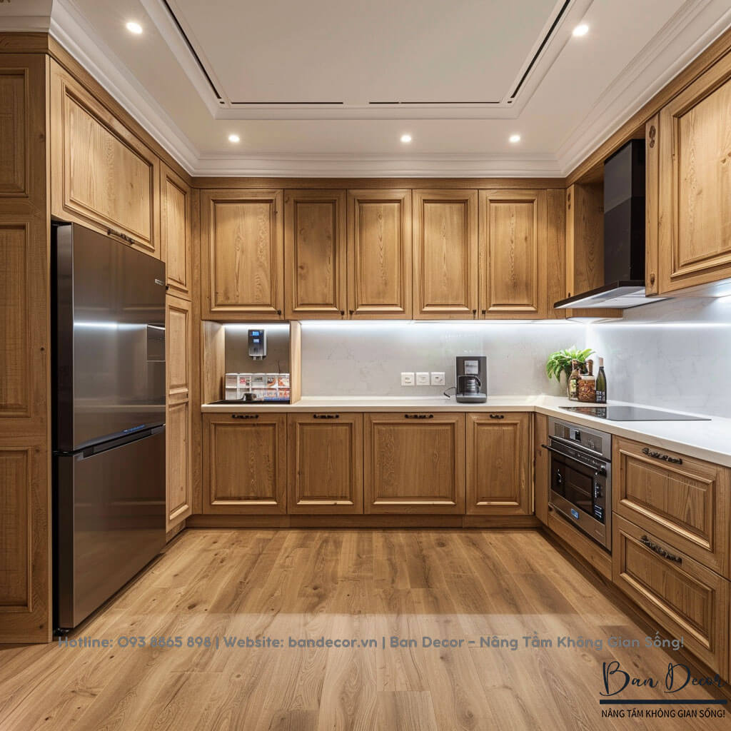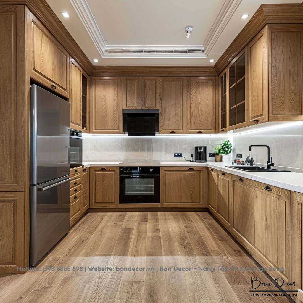 TỦ BẾP GỖ TỰ NHIÊN - VẺ ĐẸP TỰ NHIÊN VÀ BỀN BỈ THEO THỜI GIAN.  Chất liệu: Thùng tủ: 100% gỗ tự nhiên dày 17mm, hậu dày 9mm. Mặt cánh: 100% gỗ tự nhiên dày 17mm, cánh huỳnh pano đảm bảo thẩm mỹ.  Độ bền: 20 - 30 năm Xưởng sản xuất nội thất hơn 20 năm kinh nghiệm | Tay nghề thợ hơn 10 năm kinh nghiệm Bảo hành:  2 năm Thiết kế 2D - 3D miễn phí Xem thêm Mẫu thiết kế Tủ bếp gỗ tự nhiên:   bandecor.vn/nha-bep/tu-bep/tu-bep-acrylic/ bandecor.vn/nha-bep/tu-bep/tu-bep-go-cong-nghiep/