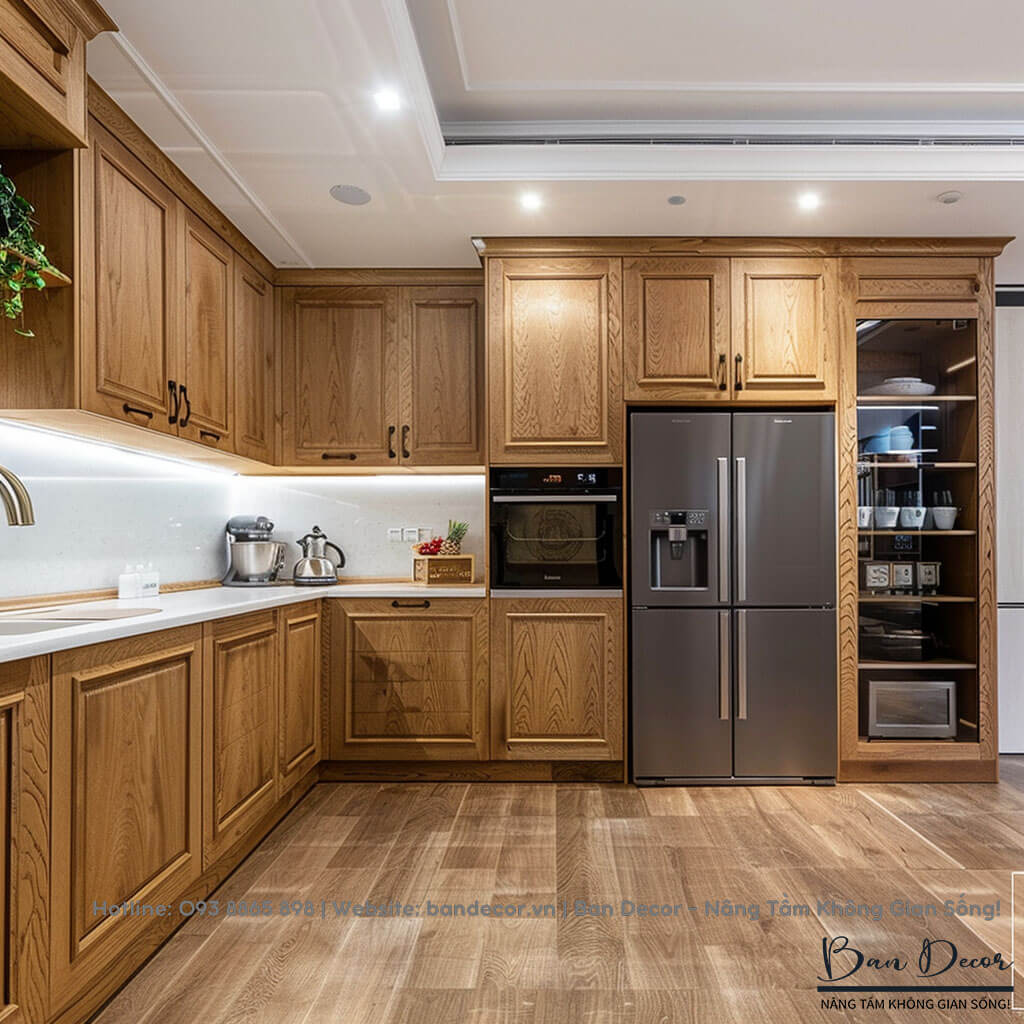TỦ BẾP GỖ TỰ NHIÊN - VẺ ĐẸP TỰ NHIÊN VÀ BỀN BỈ THEO THỜI GIAN.  Chất liệu: Thùng tủ: 100% gỗ tự nhiên dày 17mm, hậu dày 9mm. Mặt cánh: 100% gỗ tự nhiên dày 17mm, cánh huỳnh pano đảm bảo thẩm mỹ.  Độ bền: 20 - 30 năm Xưởng sản xuất nội thất hơn 20 năm kinh nghiệm | Tay nghề thợ hơn 10 năm kinh nghiệm Bảo hành:  2 năm Thiết kế 2D - 3D miễn phí Xem thêm Mẫu thiết kế Tủ bếp gỗ tự nhiên:   bandecor.vn/nha-bep/tu-bep/tu-bep-acrylic/ bandecor.vn/nha-bep/tu-bep/tu-bep-go-cong-nghiep/