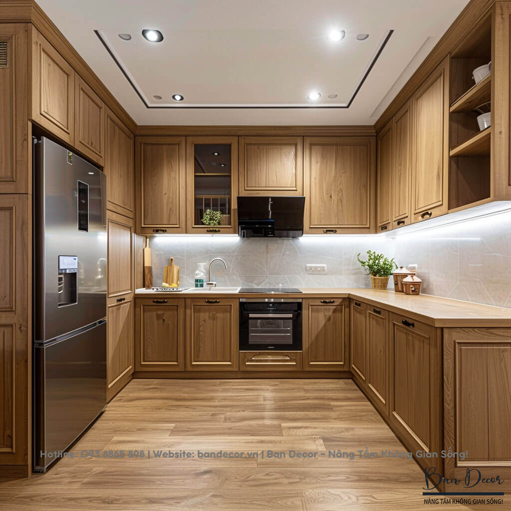 Tủ dưới: 100% gỗ tự nhiên nguyên tấm dày 17mm, hậu 9mm