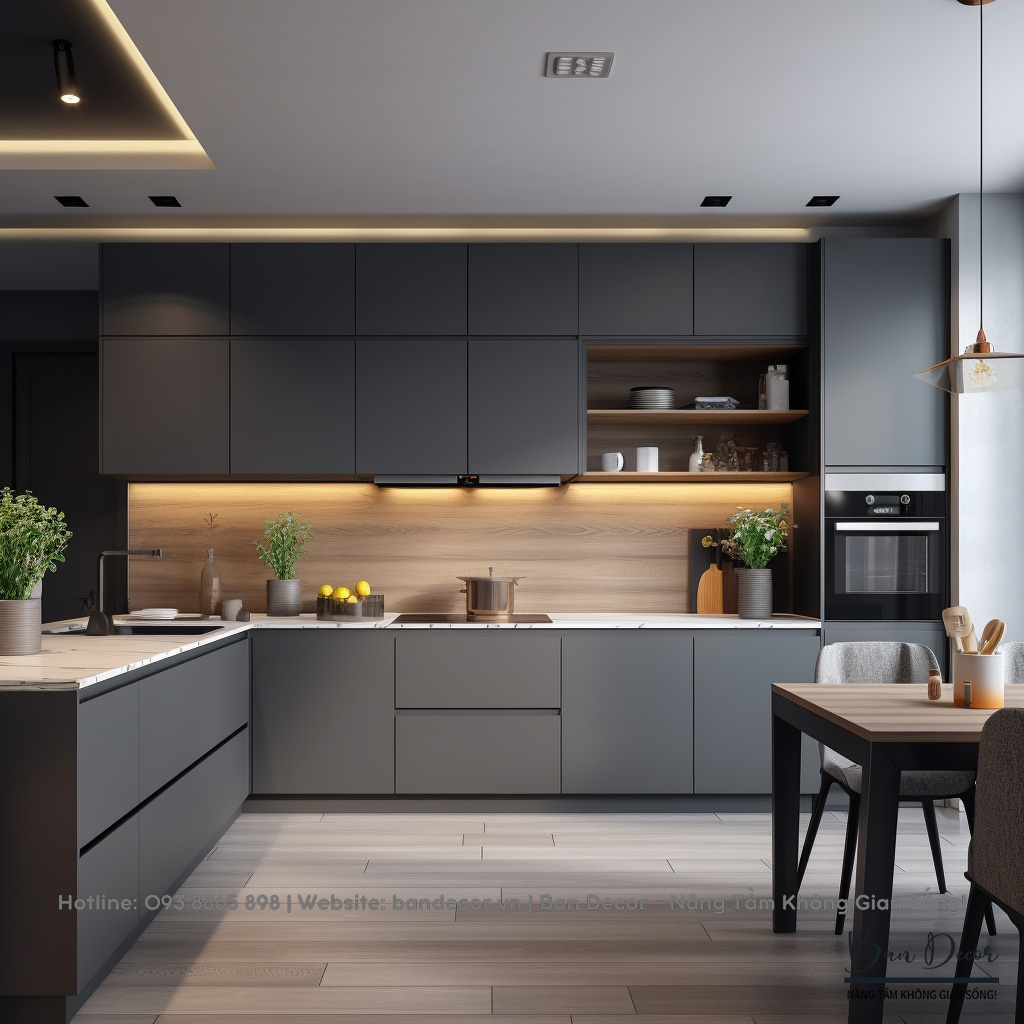Tủ dưới: 3.500.000đ/m dài, gỗ MDF chống ẩm phủ sơn PU theo màu tùy chọn.