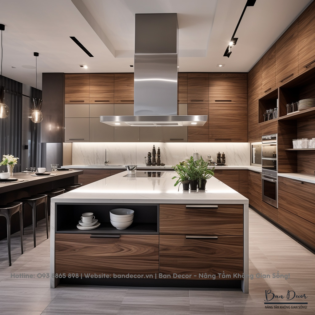 Tủ dưới: 3.500.000đ/m dài, gỗ MDF chống ẩm phủ sơn PU theo màu tùy chọn.