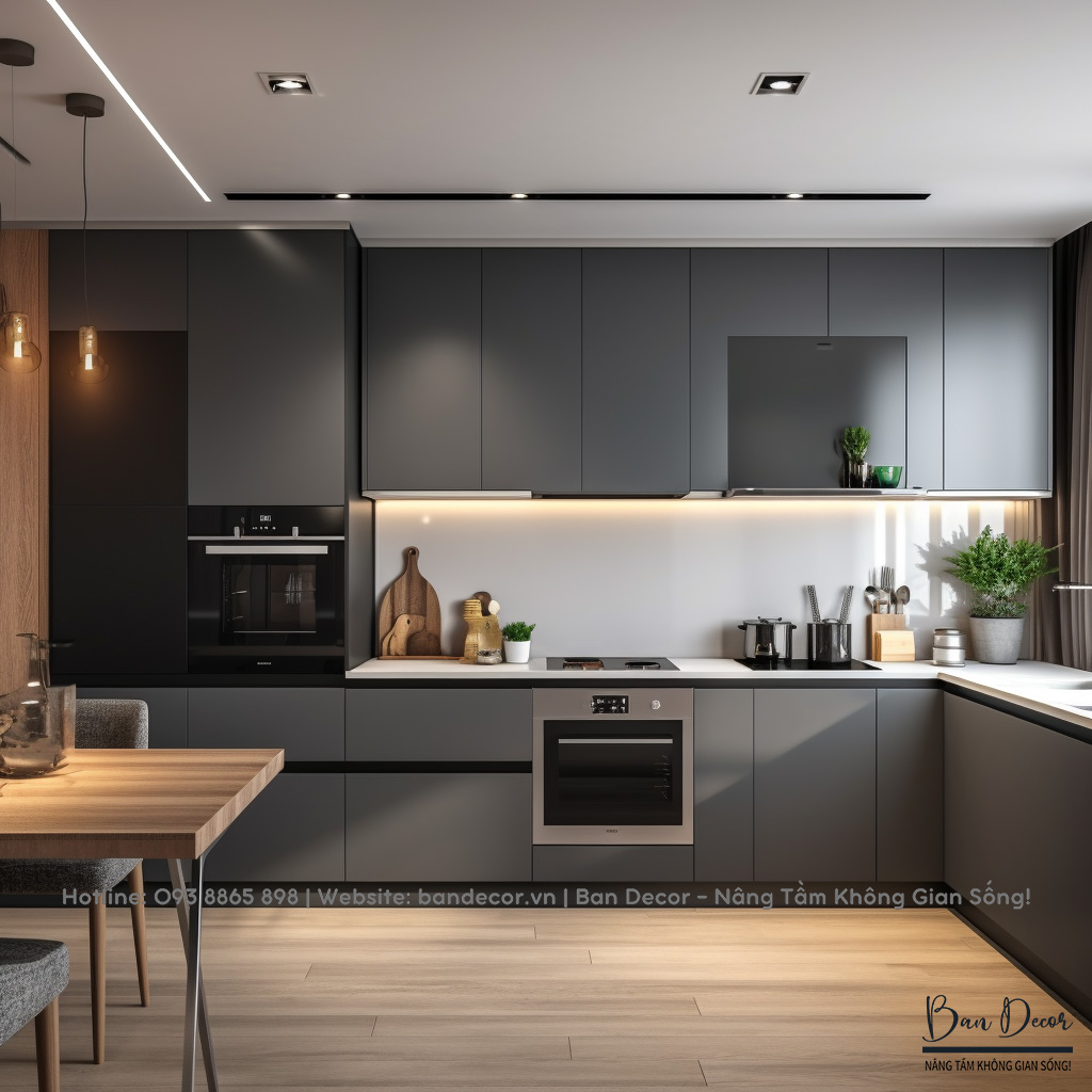 Tủ dưới: 3.500.000đ/m dài, gỗ MDF chống ẩm phủ sơn PU theo màu tùy chọn.