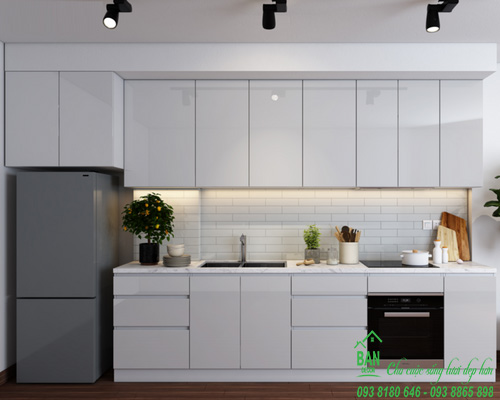 Giá: Tủ trên: 2.700.000đ/m dài, Tủ dưới: 2.900.000đ/m dài.