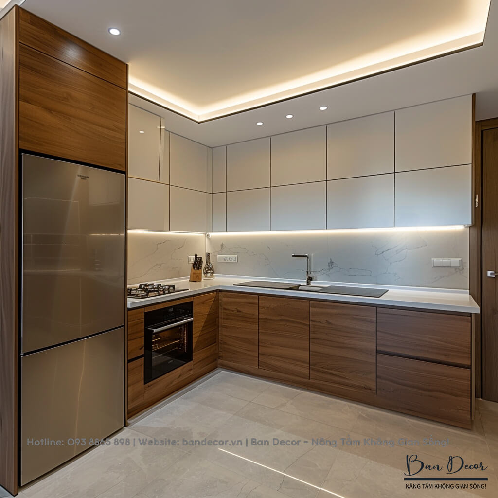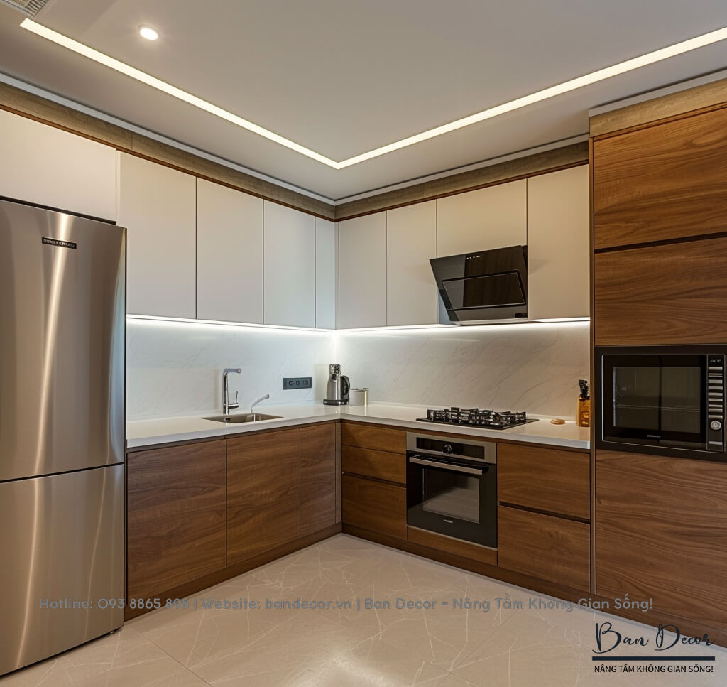 Giá: Tủ trên: 3.100.000đ/m dài, Tủ dưới: 3.300.000đ/m dài.