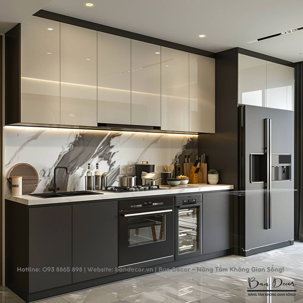 Giá: Tủ trên: 2.700.000đ/m dài, Tủ dưới: 2.900.000đ/m dài.