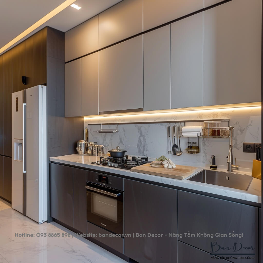 Tủ trên: 3.800.000đ/m dài, cánh phủ Acrylic bóng gương.