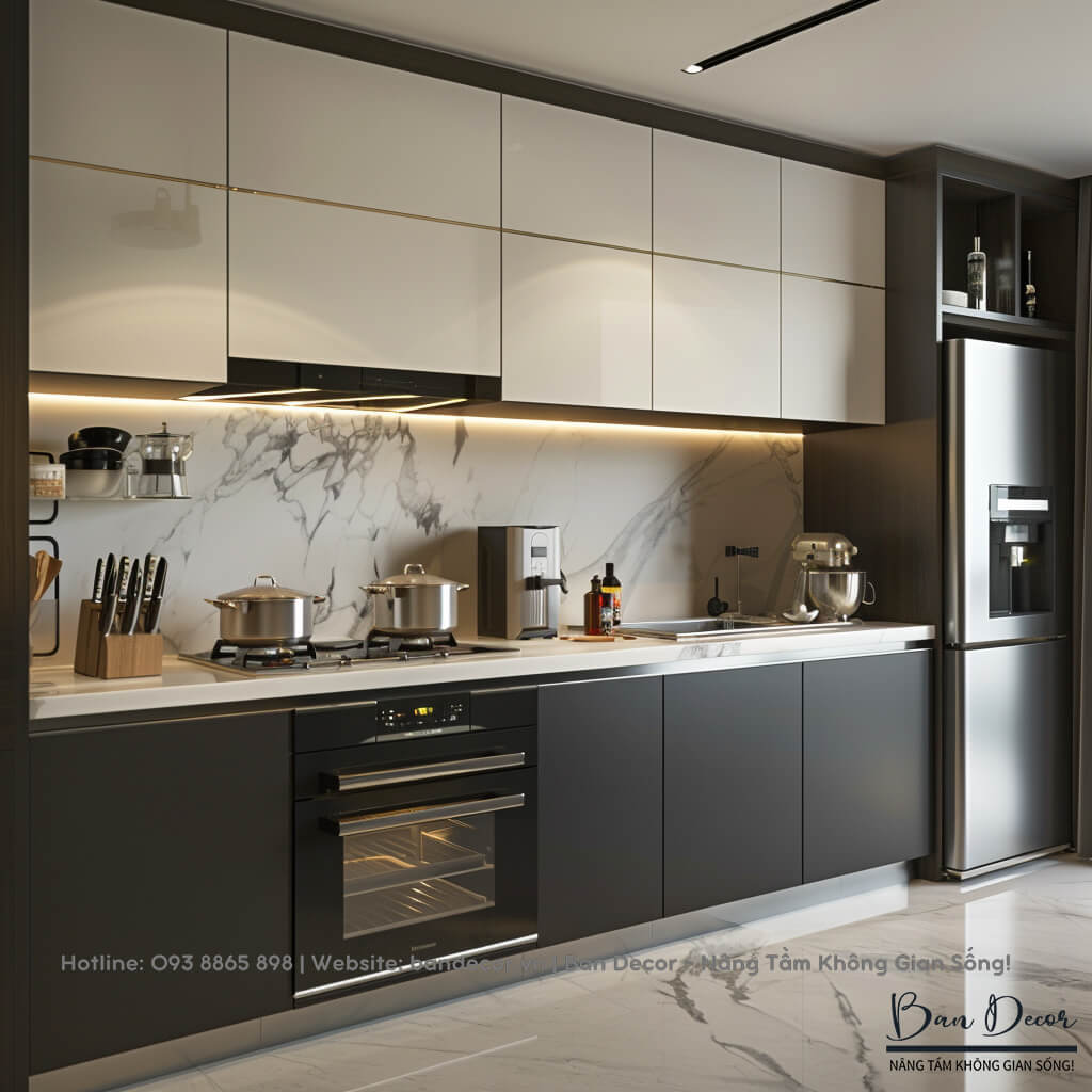 Tủ trên: 3.800.000đ/m dài, cánh phủ Acrylic bóng gương.