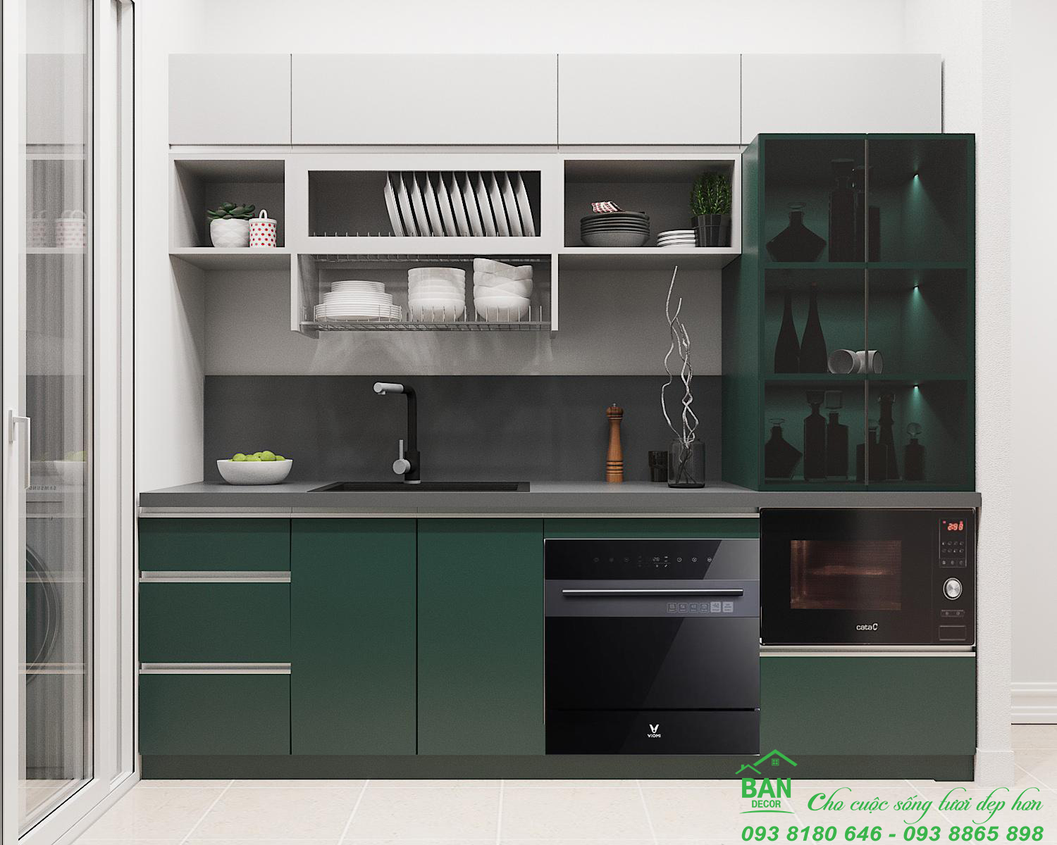 Trong khi đó tủ bếp đóng vai trò rất quan trọng sự quyết định nên nội thất nhà bếp, nhà bếp có thật sự đẹp, hiện đại và đa năng hay không do tủ bếp mang lại. Được thiết kế phù hợp với những căn bếp chung cư có diện tích vừa và nhỏ, tủ bếp gỗ công nghiệp được phủ lớp sơn PU trắng và xanh tinh tế đảm bảo đáp ứng các tiêu chí bền, đẹp, tiết kiệm diện tích và đầy đủ công năng, thuận tiện cho người sử dụng, kết hợp màu sắc với sơn tường khác màu tạo điểm nhấn nhẹ nhàng, khiến căn bếp trở nên sống động, không hề đơn điệu.
