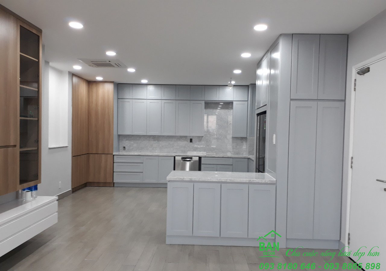 Tủ trên: 3.300.000đ/m dài, gỗ MDF chống ẩm phủ sơn PU theo màu tùy chọn