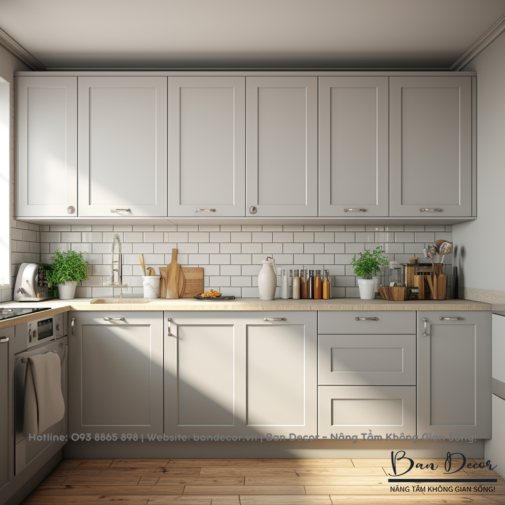 Tủ trên: 3.100.000đ/m dài, gỗ MDF chống ẩm phủ sơn PU theo màu tùy chọn