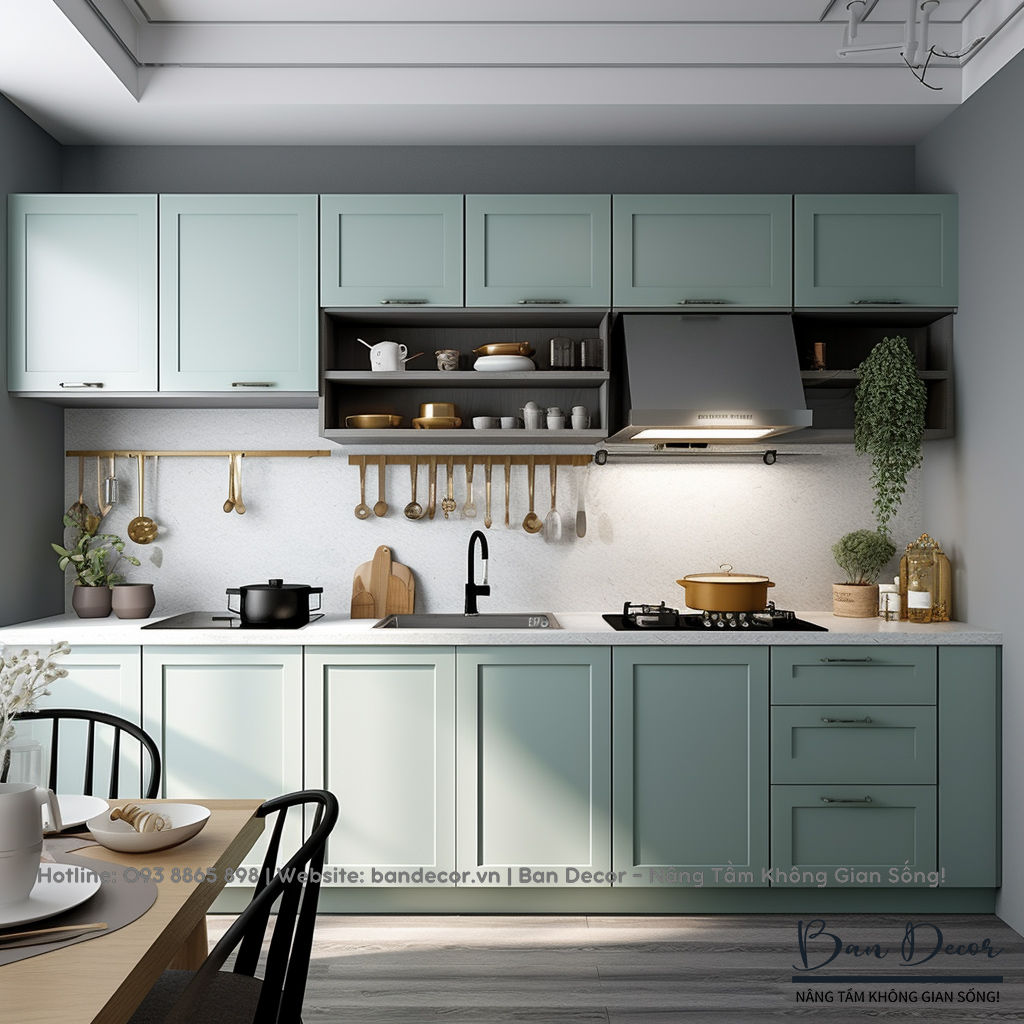 Tủ trên: 3.100.000đ/m dài, gỗ MDF chống ẩm phủ sơn PU theo màu tùy chọn