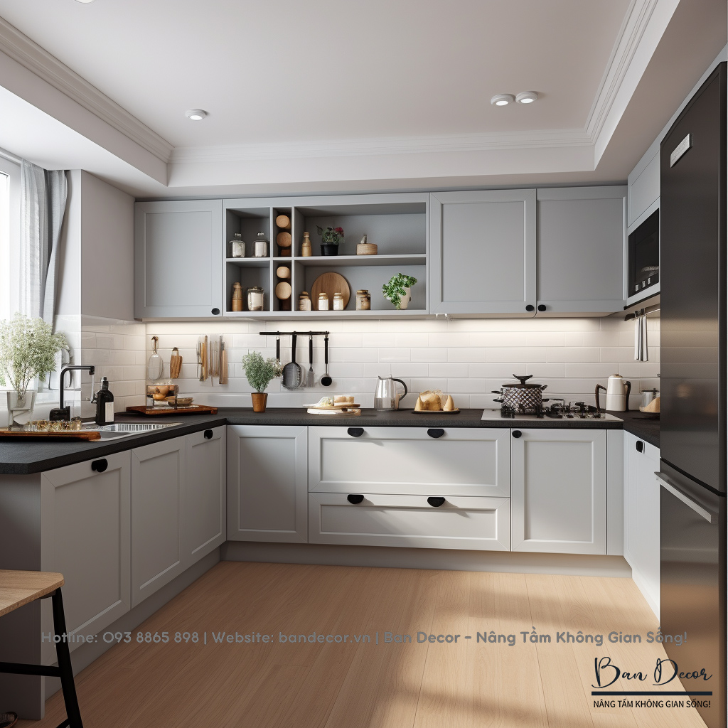 Tủ trên: 3.400.000đ/m dài, gỗ MDF chống ẩm phủ sơn PU theo màu tùy chọn