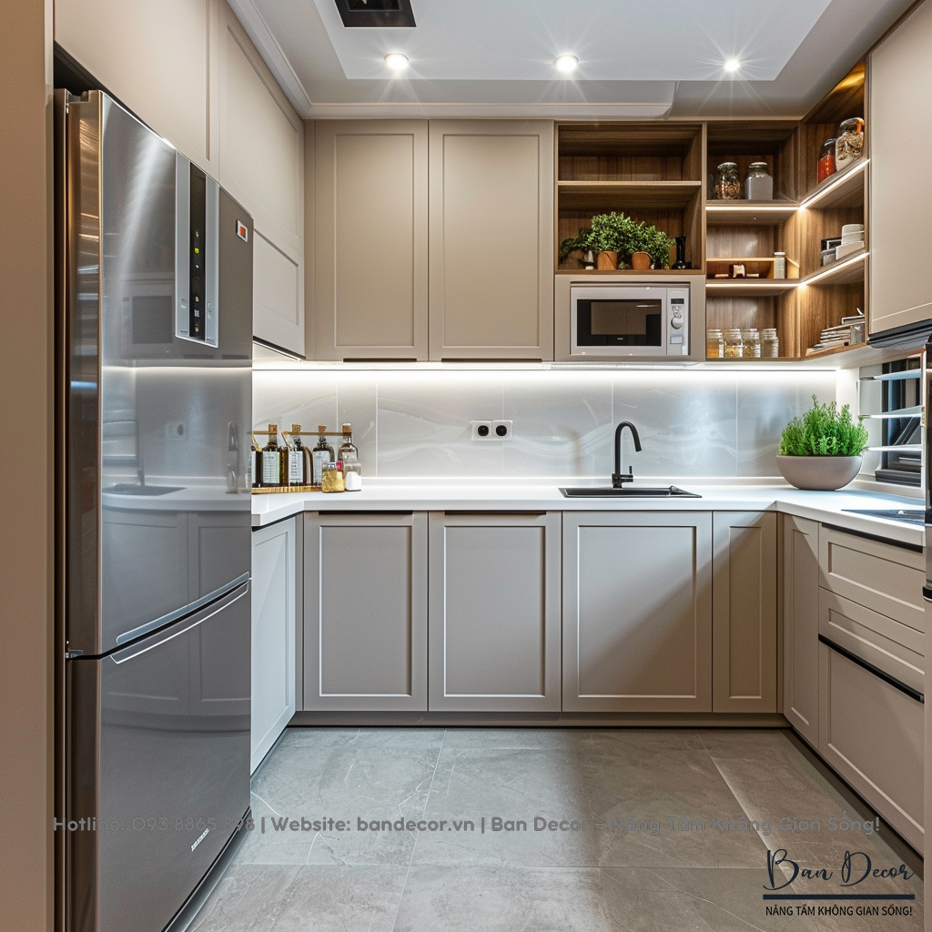 Tủ trên: 3.400.000đ/m dài, gỗ MDF chống ẩm phủ sơn PU theo màu tùy chọn