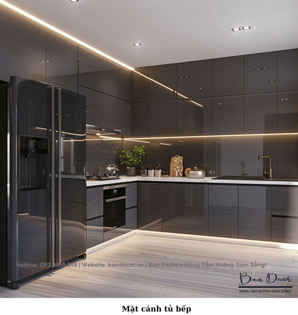 Mặt cánh tủ bếp được làm từ nhựa PVC nguyên tấm cao cấp chống nước tuyệt đối, bên ngoài phủ PVC/Melamine/sơn PU/Acrylic bóng gương.